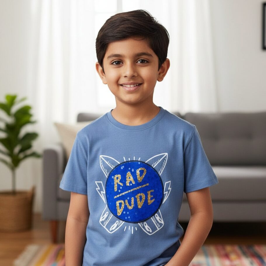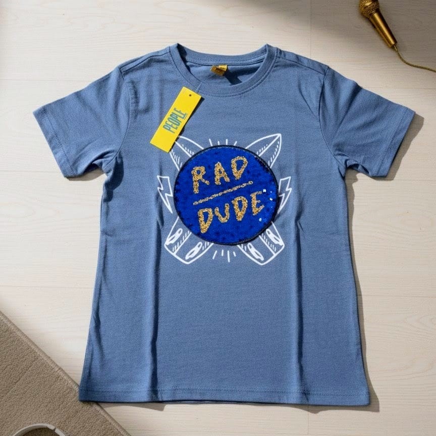 Cuenta con un diseño moderno de tablas de surf y un parche central de lentejuelas con la frase “Rad Dude”, que aporta un detalle llamativo y actual. Está confeccionada en algodón suave y fresco, ofreciendo comodidad durante todo el día.